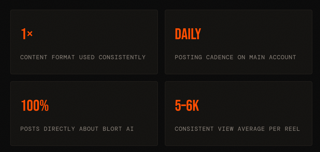 The viral mechanics are straightforward. A piece of content on a satellite account gets strong watch-time in the first hour. Instagram pushes it to the explore page. New audiences find it. Some percentage visit the main @getblortai profile. Others search for Blort AI directly. The brand gets discovered without the main account having to perform perfectly.